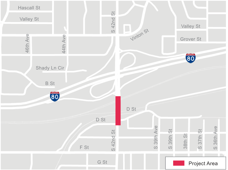 During construction, 42nd Street will be closed at D Street and immediately south of the I-80 off ramp. A detour will be provided for traffic using 42nd Street south of “D” Street. The multi-use trail under the “D” Street bridge will remain open except for periodic closures during specific construction activities where the safe use of the trail cannot be maintained.