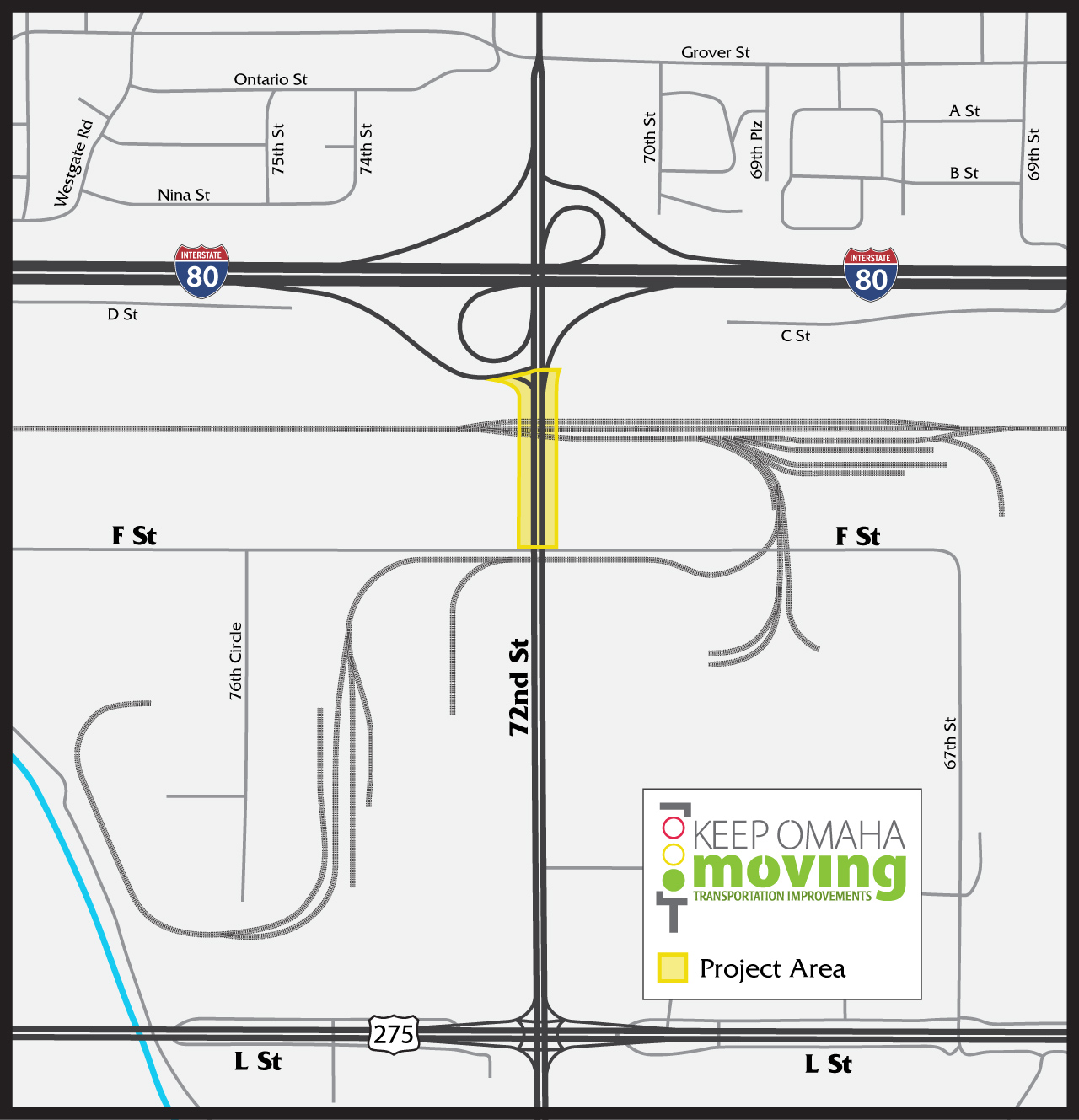 Roadway improvements are planned for 72nd Street, between F Street and just south of I-80, which serves as a vital connection for commuters and industrial businesses in the area. In addition to deteriorating bridge conditions, current traffic volumes indicate that this corridor is over capacity during peak hours and traffic volumes will continue to increase over time. Improvements are needed to improve capacity and safety, and decrease congestion.