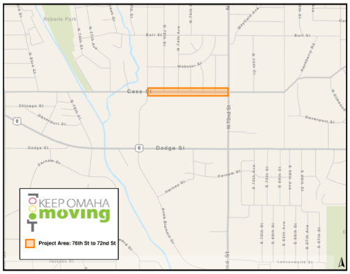 As a part of the Crossroads redevelopment site, improvements to Cass Street will need to be made. A center median will be constructed with dedicated left turn lanes at 74th Ave. The south side of Cass will be widened to provide enough space for the added median. Entrances for the Crossroads development will be constructed at 74th Ave and 75th Ave.