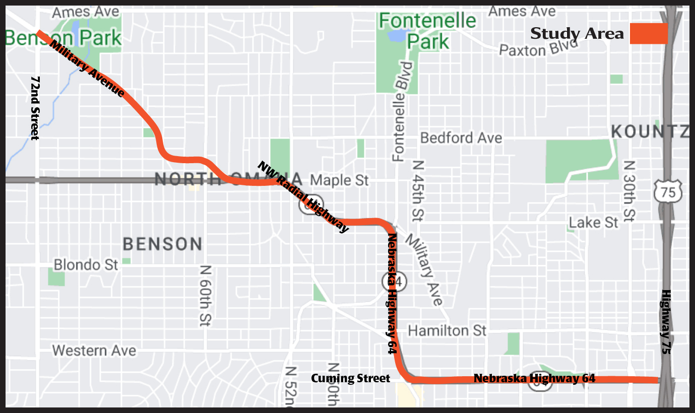 The purpose of this project is to improve safety for all users, walkability and multi-modal opportunities along the Nebraska Highway 64 / Link Highway 28-K corridor of Cuming Street (28th Street to Northwest Radial Highway), Northwest Radial Highway (Cuming Street to Military Avenue/ 63rd Street), and Military Avenue (Northwest Radial Highway/ 63rd Street to 70th Avenue). On average, there is 1 fatality along this corridor per year. There are more than 6 pedestrian crashes on the corridor which include fatalities. Increasing transit and multi-modal opportunities for this corridor are included in the Metropolitan Area Planning Agency’s (MAPA) Long Range Transportation Plan (LRTP) which identified the corridor as a potential bus route and for improved bus service.