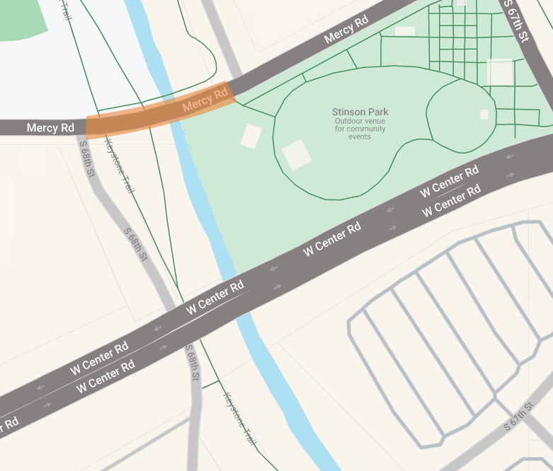 The Mercy Road bridge over the Big Papillion Creek between 68th Street and Aksarben Drive is in need of repair. New approach slabs will be constructed to replace the existing approach slabs which are settling and have significant cracking. Bridge deck repairs will be completed, and new concrete barrier rail will be constructed. In addition to bridge repairs some minor pavement and sidewalk replacement will be completed. These repairs will extend the life of the bridge and provide necessary rehabilitation to the structure.