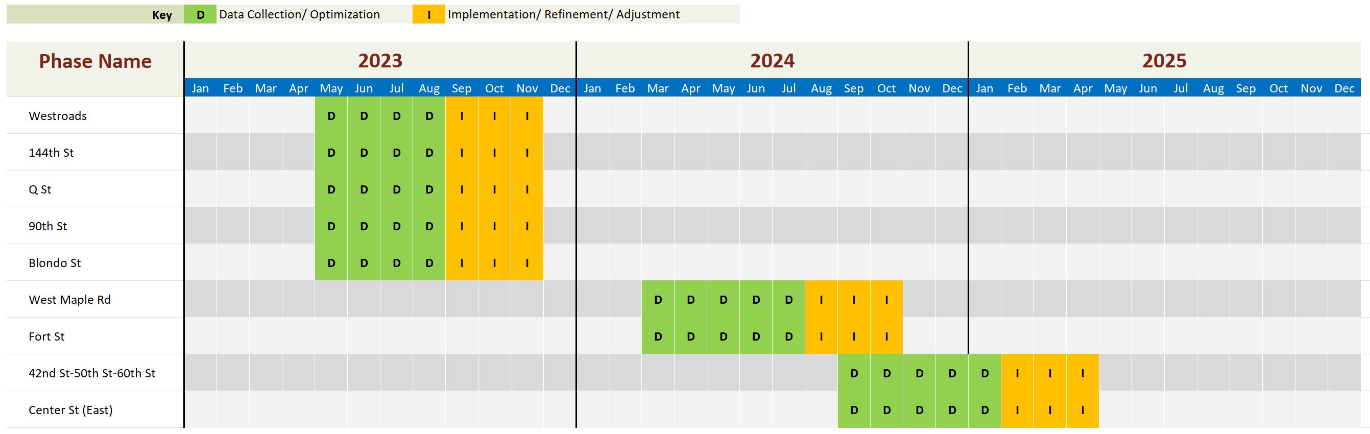 Due to the number of corridors in the City, the effort to complete the re-timing efforts, and availability of funding, the retiming program will group various corridors together for a project to re-time the traffic signals. Each corridor re-timing project will take place in several phases as described below.